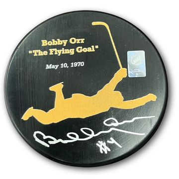 Freeze time at the exact moment Bobby Orr took flight. This commemorative puck celebrates the legendary overtime winner on May 10, 1970—the play that turned Orr into an icon. The bold silhouette artwork and silver autograph make it a dynamic, display‑ready showpiece. Each puck ships with a Certificate of Authenticity and protective packaging. For Boston loyalists and serious collectors alike, this is the signature that tells the story of a franchise, a city, and a legend.