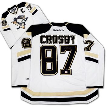 This Sidney Crosby Autographed Pittsburgh Penguins White Jersey – Limited Edition /87. Personally signed by Crosby, this officially licensed jersey is authenticated with a Certificate of Authenticity and hologram to ensure absolute legitimacy. With only 87 pieces available worldwide, this signed Crosby jersey is a must-have for NHL memorabilia collectors. Sized L or XL, it makes a stunning display for your home, office, or collection. Product dimensions: 34 x 28 x 0.12 inches