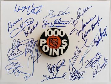 This unique and awe-inspiring 1114 photo presentation honors 20 members of the NHL's celebrated 1000 points club and features an astounding number of All-Stars, superstars, and HOFers, each of whose signature was obtained in person by a noted NHL photographer. Includes: Wayne Gretzky, Gordie Howe, Bobby Hull, Steve Yzerman, Jean Ratelle, Jean Beliveau, Henri Richard, Frank Mahovlich, Dennis Potvin, John Bucyk, Paul Coffey, Rod Gibert + others. All Signatures are MINT. Manufacturer: Sports Memora