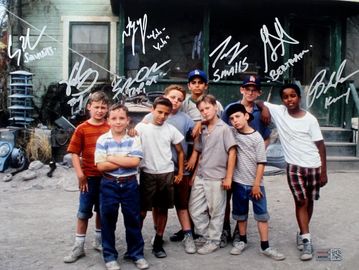 The Sandlot Cast Signed Autographed 11x14 Photo - 7 Signatures, Leopardi & More TRISTAR. Hand signed by Chauncey Leopardi (Squints), Brandon Adams (Kenny DeNunez), Victor DiMattia (Timmy), Grant Gelt (Bertram), Tom Guriy (Smalls), Shane Obedzinski (Repeat), and Marty York (Yeah-Yeah). Each autograph includes an individually numbered TRISTAR Authentic hologram that can be verified online.